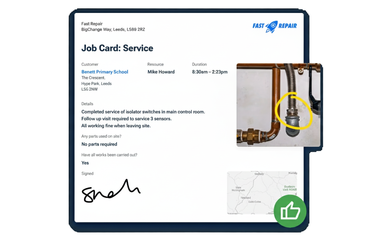BigChange tip: With BigChange, job card templates can be customised with your branding, and supporting documents like certificates or reports can be attached directly to the job, so everything related to the job sits in one place.